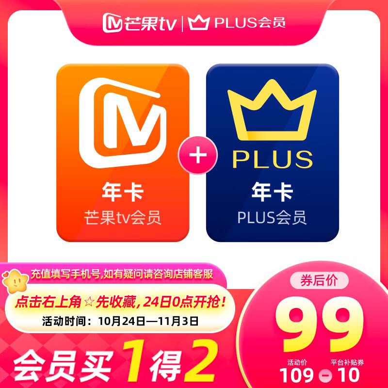 ¥99 【买一赠一】芒果TV会员12个月年卡+京东Plus年卡 109