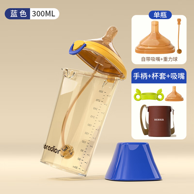¥129 贝思卡儿二代感温翻盖吸管防胀气婴儿6-12个月奶瓶300ML宽口径宝宝PPSU 蓝色 300ml 手柄+杯套+吸嘴 159