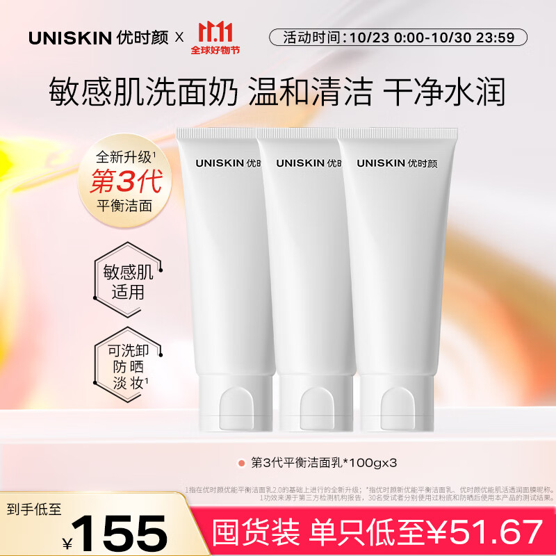 ¥145 优时颜(UNISKIN)洗面奶氨基酸洁面乳100g*3保湿舒缓清洁男女卸妆敏感肌可用礼物 155