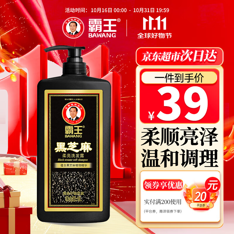 ¥21 霸王黑芝麻洗发水男女士柔顺亮泽洗发露1L 黑亮滋养改善干枯毛躁发质 39