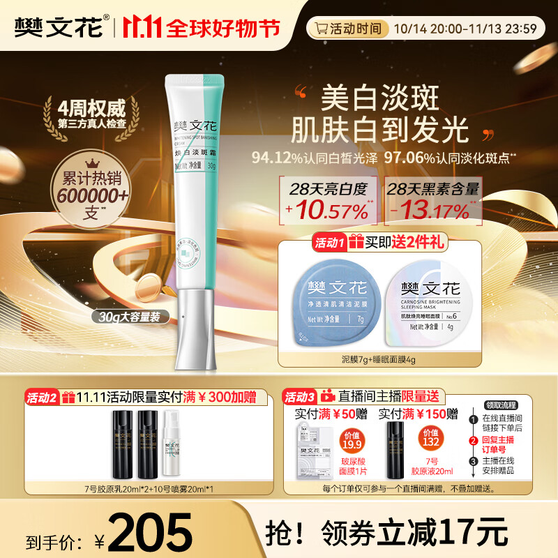 ¥205 樊文花4号焕白淡斑霜377美白提亮肤色保湿净白祛斑面霜送女生礼 30g组合款-1 222