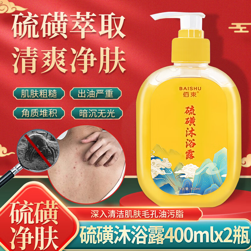 ¥19.9 佰束硫磺沐浴露清洁后背油腻粗糙可用洁净多效滋润硫磺液体香沐浴露皂 硫磺清爽沐浴露 400ml 2瓶 49.9
