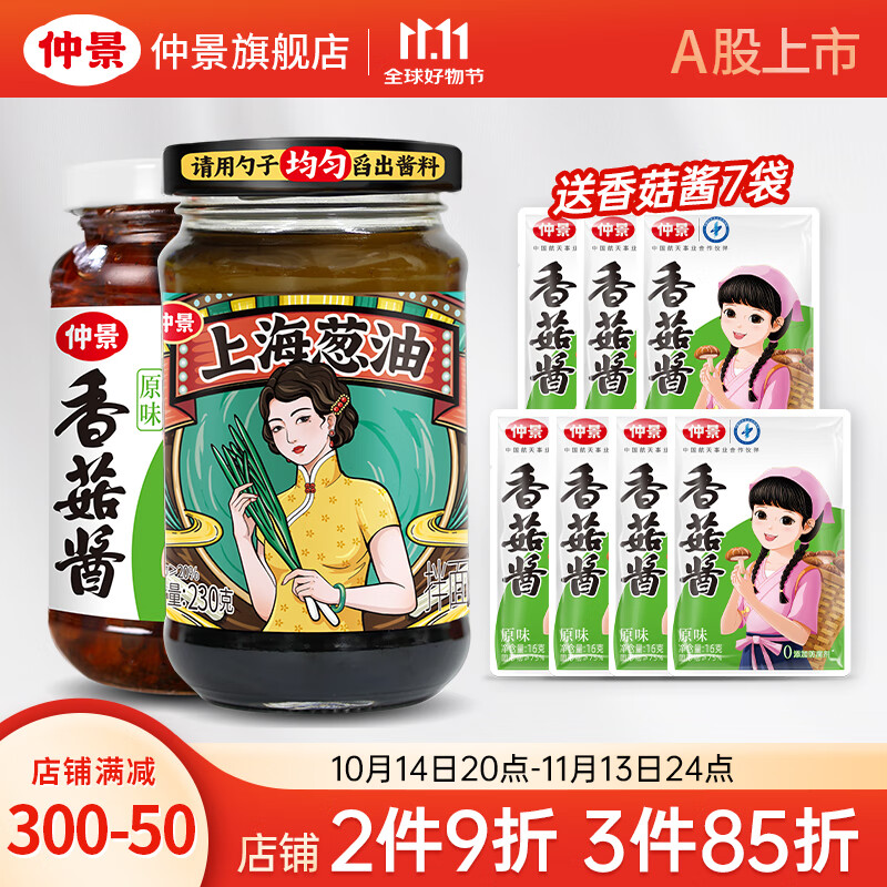 ¥23.9 仲景 香菇酱上海葱油成都红油组合 葱油拌面酱油泼辣子拌饭夹馍调味酱 原味香菇酱230g+原味葱油230g 25.9
