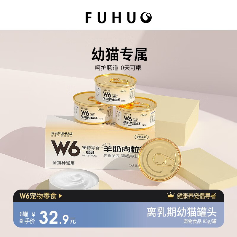 ¥16.9 俘获W6猫罐头营养补水细腻流食猫咪零食成幼猫湿粮罐头 羊奶肉粒杯6罐装1盒 32.9