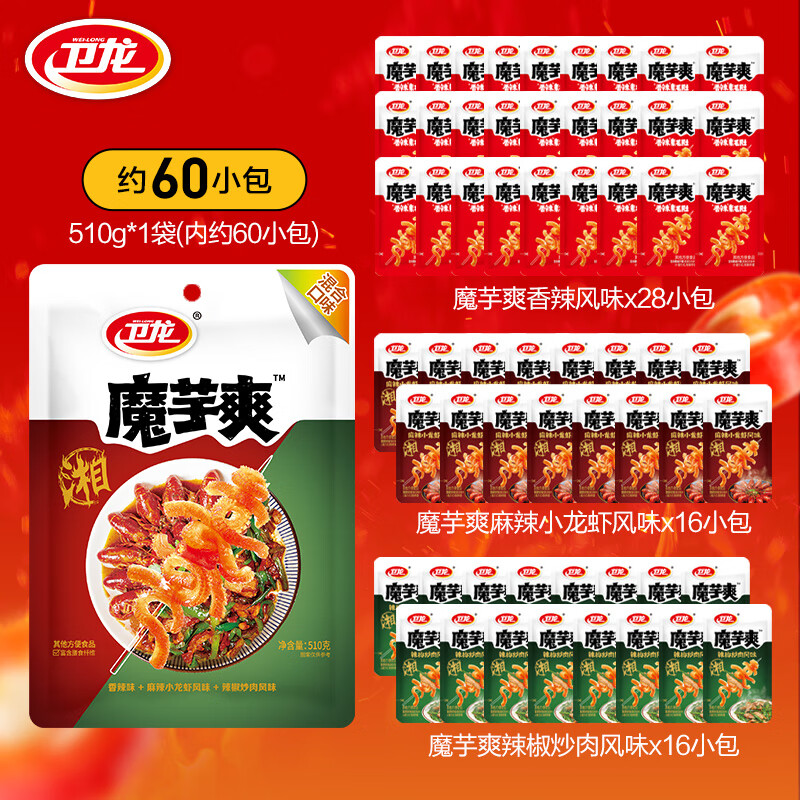 ¥19.9 卫龙辣条魔芋爽上菜系列麻辣小龙虾小炒肉休闲零食大礼包生日礼物猫窝 混合口味510g|约60小包 29.9