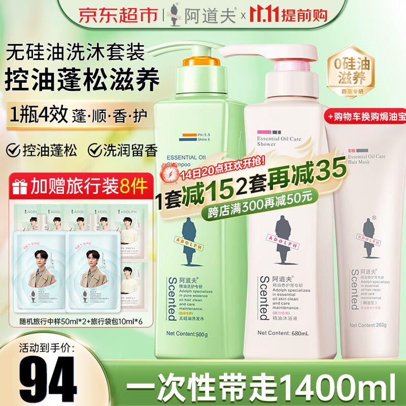 ¥94 阿道夫无硅油洗发水沐浴露套装 控油去屑清爽蓬松柔顺洗头膏留香男女士 无硅油洗发水500ml+沐浴露680ml 109