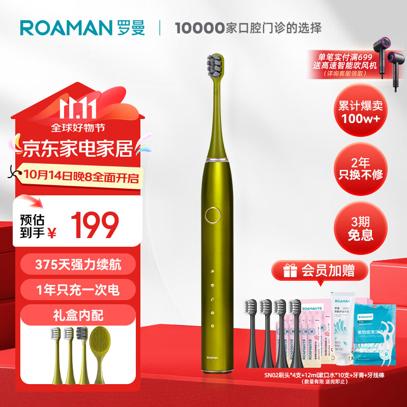 ¥255.55 罗曼(ROAMAN)智能声波电动牙刷情侣款送男友女友生日礼物 5种模式牙医推荐 网红小果刷1年续航 牛油果绿款 269