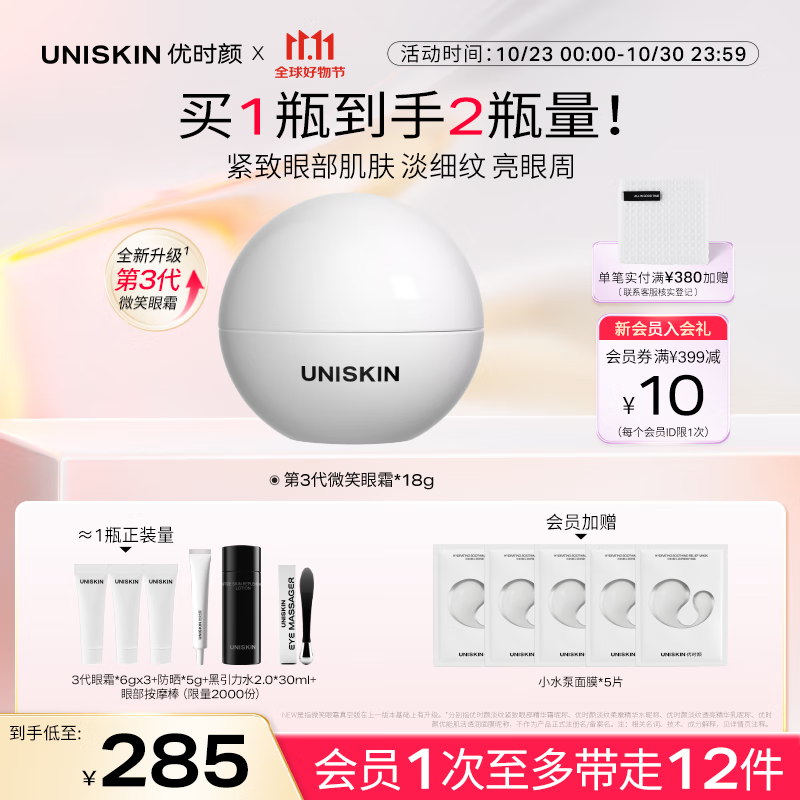 ¥325 优时颜(UNISKIN)第3代微笑眼霜18g淡化眼纹紧致抗皱保湿提亮眼周送女友生日礼物 335