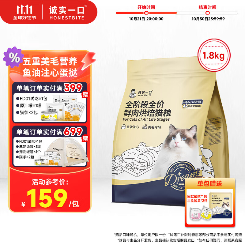 ¥159 诚实一口奇迹小金袋美毛亮毛专研全鲜肉鸡肉烘焙猫粮1.8kg【重磅新品】 201