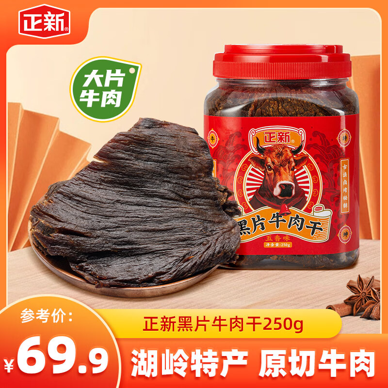 ¥99.8 正新 黑片牛肉干零食大片手撕风干黄牛肉正宗温州瑞安湖岭特产小吃 五香味1罐+沙嗲味1罐 139.8