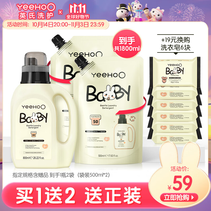 ¥49 英氏婴儿洗衣液宝宝专用洗衣皂液儿童内裤洗液天然酵素去污柔护洗衣液 柔护洗衣液800ml*1+500ml*2 59