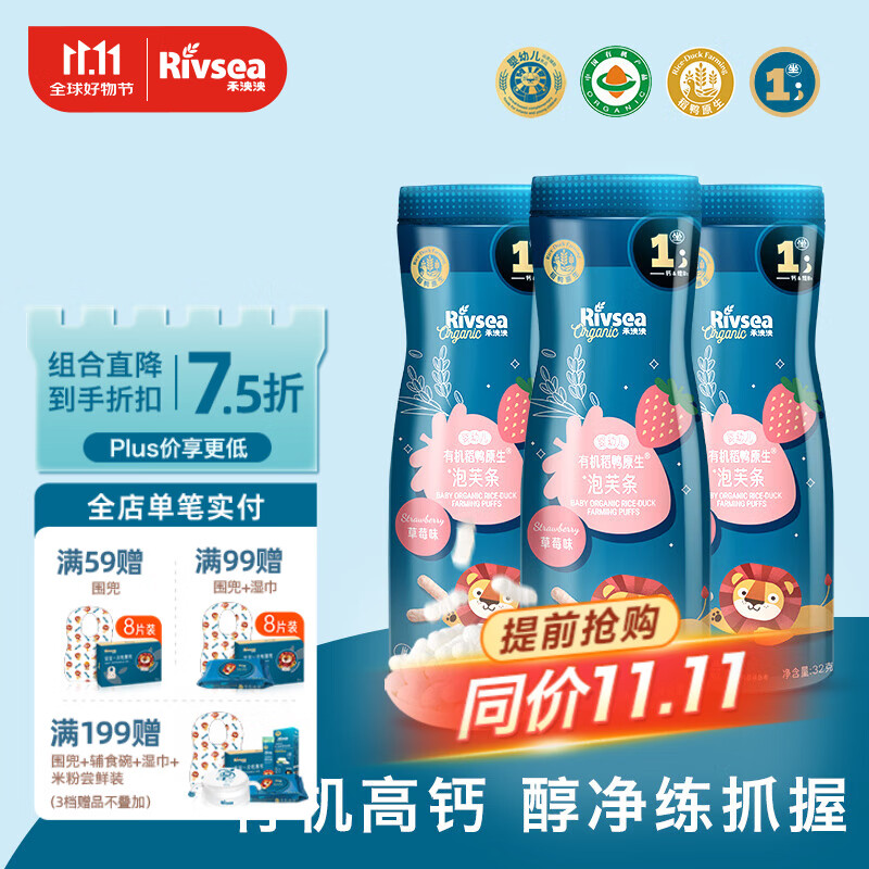 ¥108.4 禾泱泱婴幼儿稻鸭原生泡芙条 宝宝零食6个月以上 高钙方便携带 有机泡芙条3罐(草莓*3) 119.4