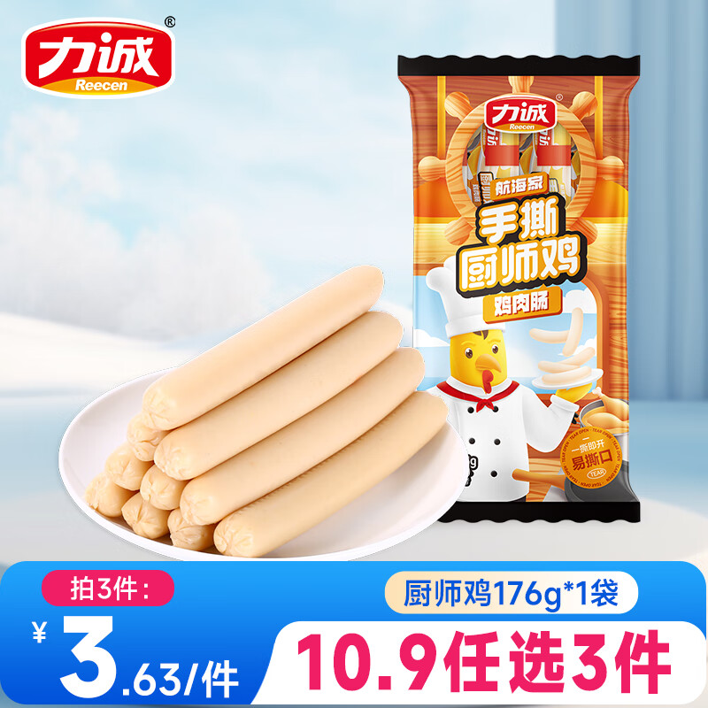 ¥7.3 力诚火腿肠鸡肉肠 香肠即食火腿肠烧烤肠泡面搭档 烧烤火锅肠方便食品 【厨师鸡】176g*1袋 10.3