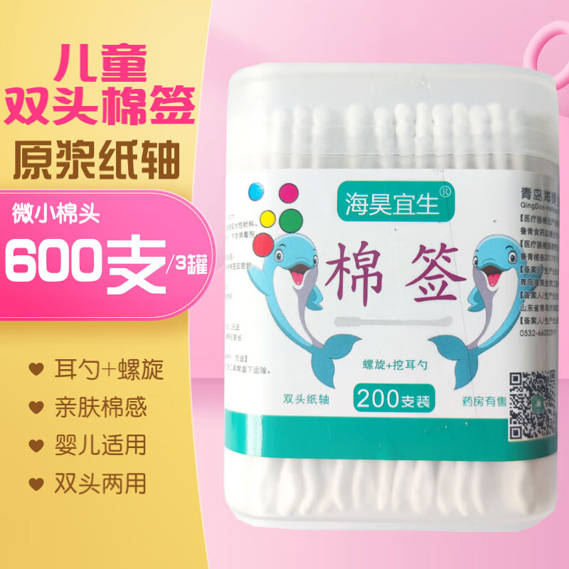 ¥9.9 海昊宜生双头棉签医用掏耳朵化妆画眼线棉棒一次性尖头圆头婴儿脱脂清洁卫生棉花棒 纸轴-儿童双头棉签【600支/3罐】螺旋+挖耳勺 19.9