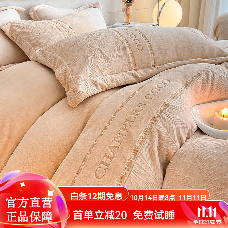 ¥299 史黛拉轻奢高级感牛奶绒床上四件套秋冬季珊瑚绒法兰绒双面加绒被套床单 香槟色【双面加厚牛奶绒 精美雕花刺绣】 1.8m床【床单款四件套】适200x230cm被芯 319