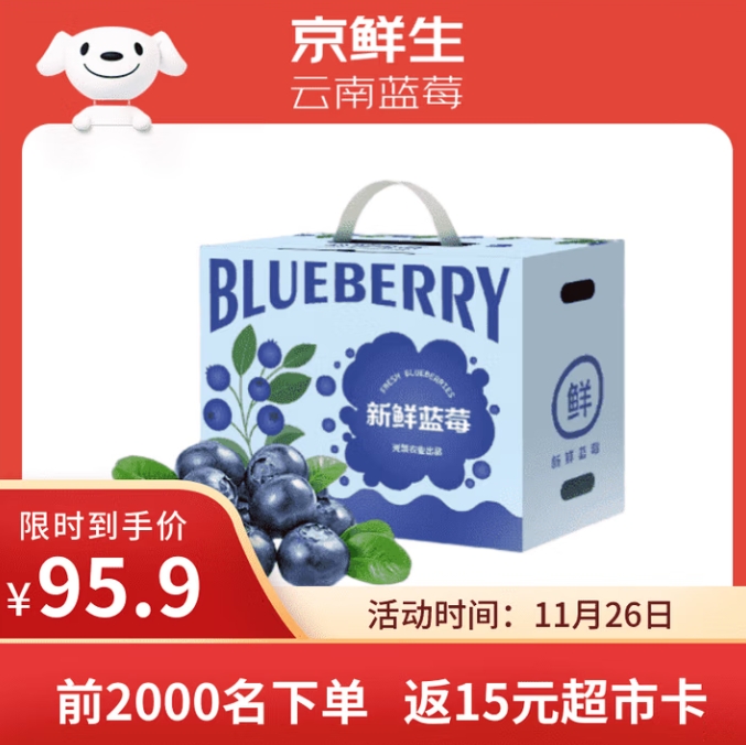 79.9元包邮!京鲜生 云南蓝莓22mm+超大果 6盒装(返15元E卡后)