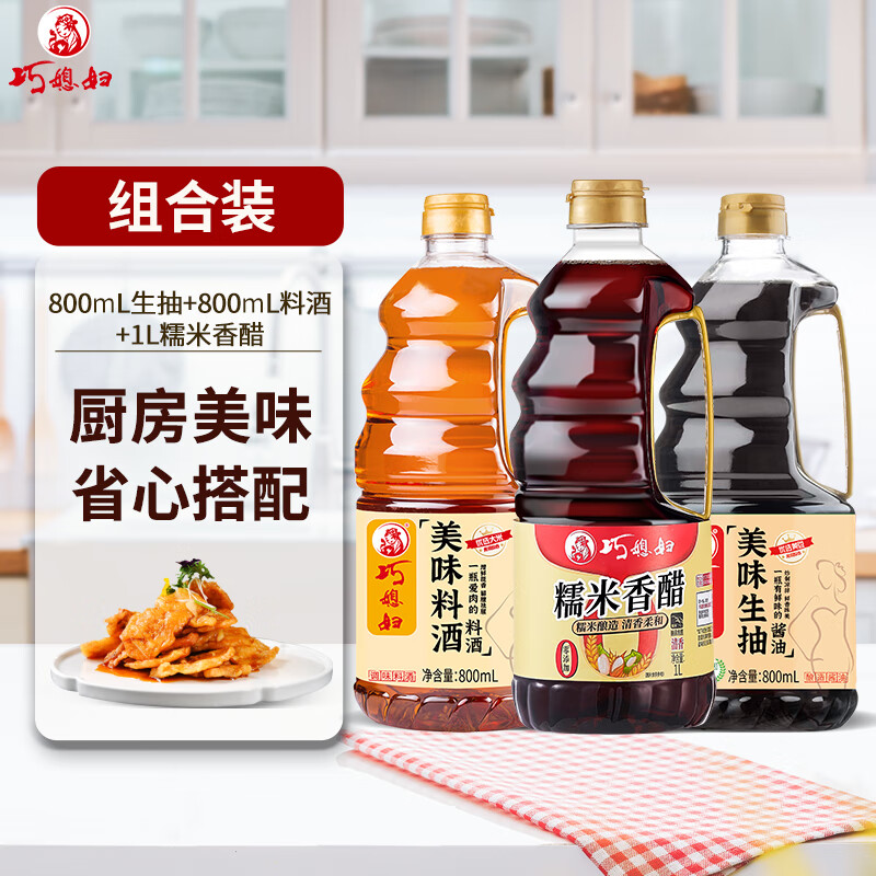 ¥23.9 巧媳妇美味生抽家用炒菜凉拌调馅酿造酱油实惠800ml 1L糯米香醋+800ml生抽+800ml料酒 25.9