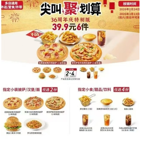 【到店】37.5元!必胜客 小装披萨汉堡6件套