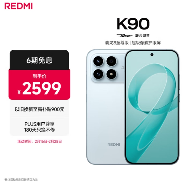 2088元!红米 小米REDMI K90 骁龙®8至尊版 7100mAh大电池 青山护眼 水蓝色 12GB+256GB 红米5G手机