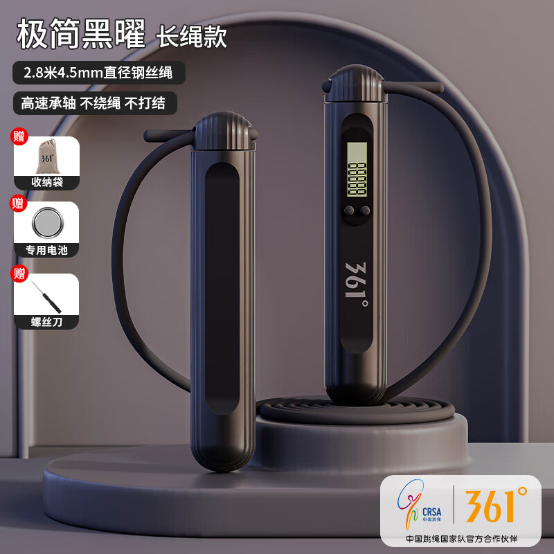 ¥46.9 361°跳绳健身女负重无绳款专业燃脂中考专用学生计数钢丝绳子 极简黑曜【2.8M钢丝绳】 76.9