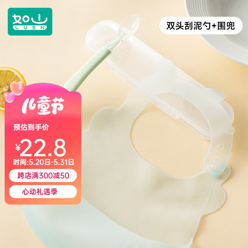 ¥38.9 如山【精选直发】316不锈钢刮泥勺婴儿辅食勺果泥勺子宝宝吃水果挖泥 薄荷绿果泥勺+硅胶围兜 68.9