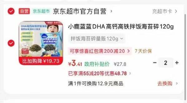 宝宝超爱!小鹿蓝蓝DHA高钙高铁拌饭海苔碎首单拍2件每件仅3.41元!