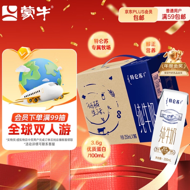 ¥79.8 百补79.8元!特仑苏纯牛奶250ml*16包*2箱                                                89.8