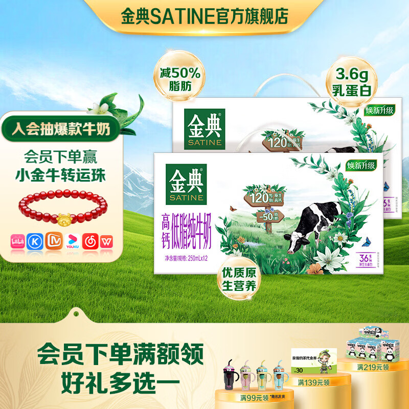 金典高钙低脂纯牛奶2箱装仅75元!健康年货礼盒限时抢