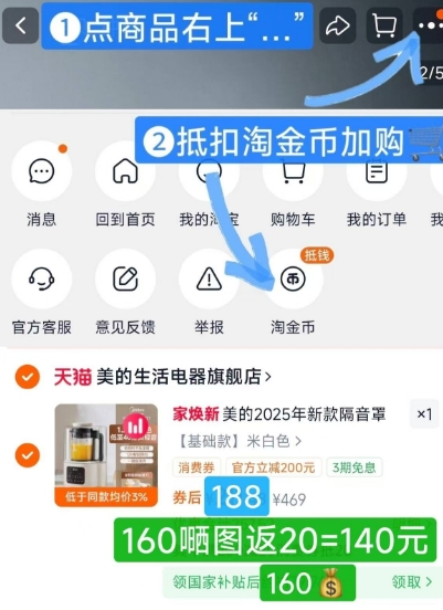 拍469元选项,商品页右上角三个点点进去-底部淘金币点进去-淘金币 我的足迹页拍,叠上方2处券+国补,付160元包邮,嗮图-返20元=140元;美的破壁机神车!好'忦速