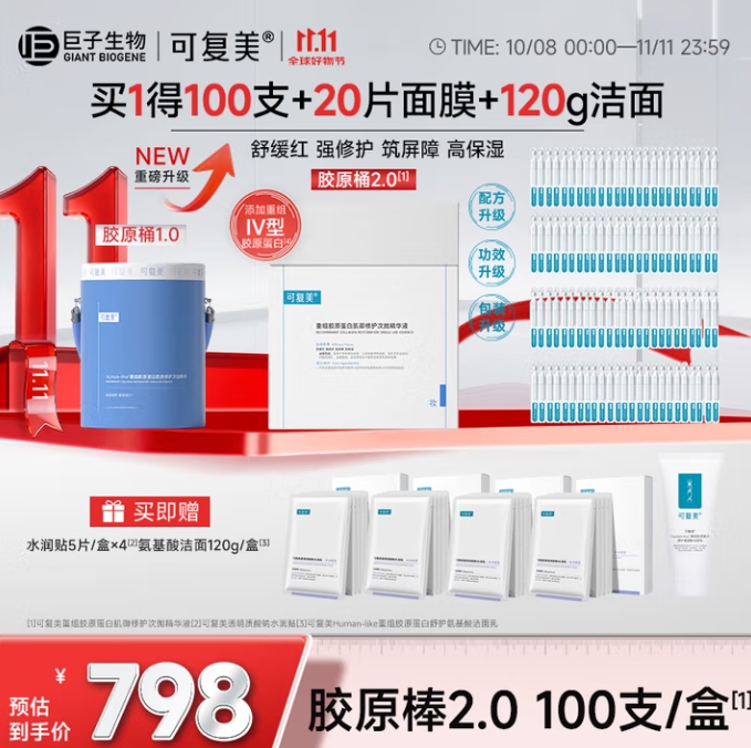 598元!可复美胶原桶 得胶原棒100支+面膜20片+洁面120g