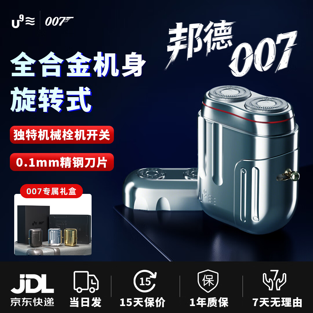 ¥308 U9邦德007电动剃须刀男士刮胡刀便携防水全身水洗强劲动力合金机身精钢刀片高端男士节日礼物送男友 007邦德银色(礼盒装) 328