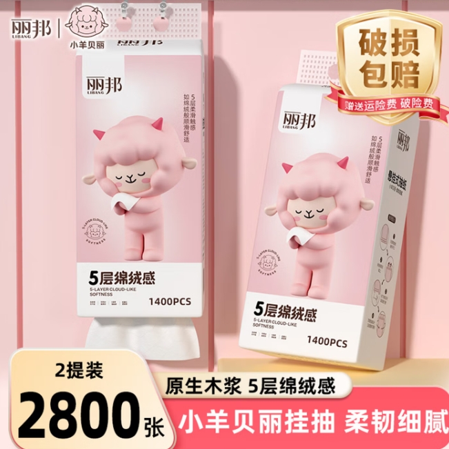 6.9元包邮!丽邦·悬挂式抽纸 1400张×2大提