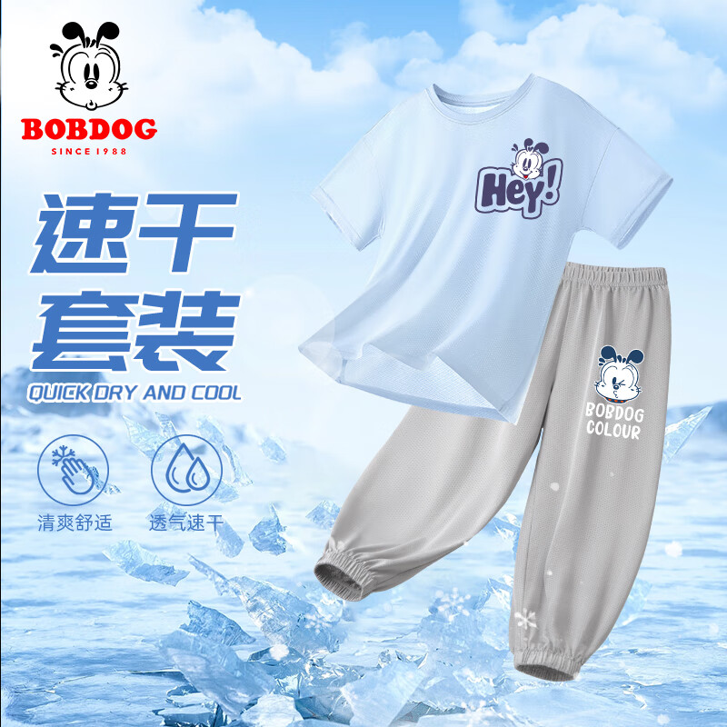 ¥49.9 巴布豆男童套装夏季儿童速干衣运动童装网眼防蚊裤凉感透气中大童两件套 蓝 嘿巴布X+灰 嘟嘴巴布X 110 79.9