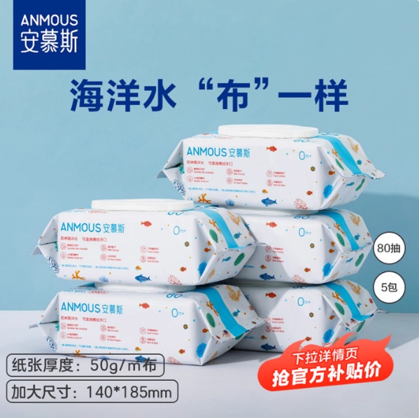 18.6元包邮!安慕斯·婴儿海洋水湿纸巾5包*80抽