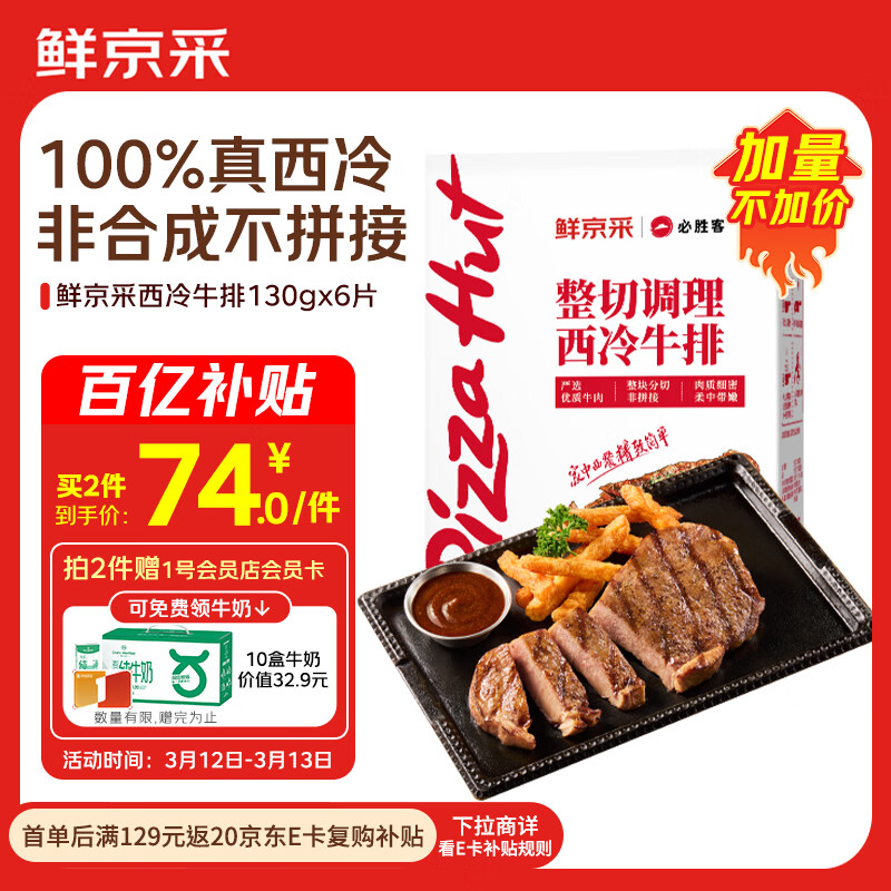 鲜京采X必胜客联名西冷牛排780g,折后仅148元/2件