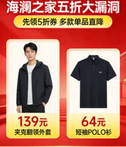 海澜之家5折大促:夹克139元/POLO衫64元起,手慢无