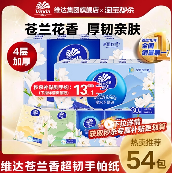 12.3元包邮!维达·小苍兰手帕纸五层加厚54包