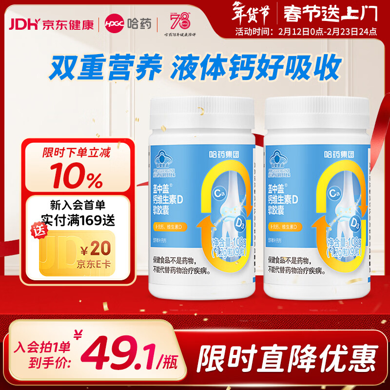 【限时特惠】哈药盖中盖钙维生素D软胶囊90粒*2瓶,京东Plus会员价仅33.55元!