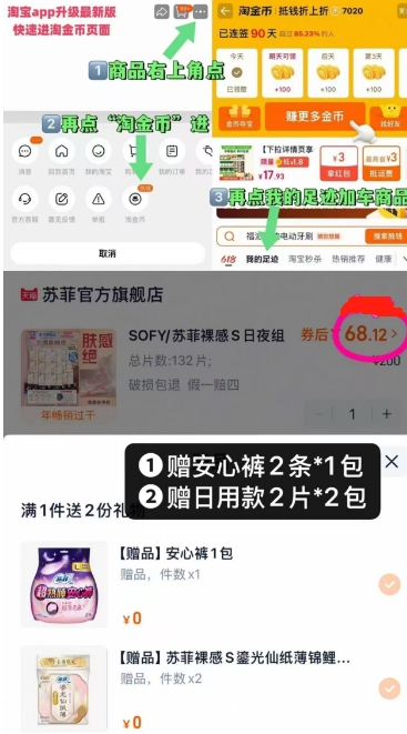 在售价200元,领68元券+5.4元礼金,如下图抵扣金币,叠凑单+淘金币,拍132片发160片,付68元,折0.4元/片‼️苏菲高端裸感S,这个也超值,加贈安心裤*2条➕日用*4片