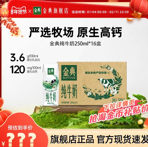 34.9元包邮!金典官旗 纯牛奶250ml×16盒