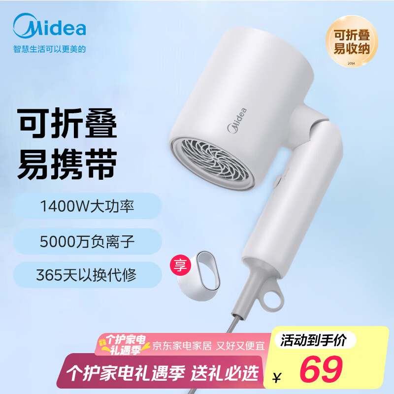 ¥68.85 美的(Midea)五千万负离子护发电吹风 折叠便携吹风机 宿舍吹风筒FZ110白 1400W 家电国家补贴 节日/生日礼物 69