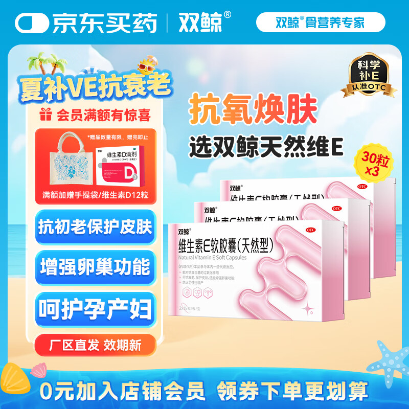 ¥45 [双鲸] 维生素E软胶囊(天然型) 抗衰老 护肤 呵护卵巢 保护心脑血管 孕期必备 30粒*3盒 52