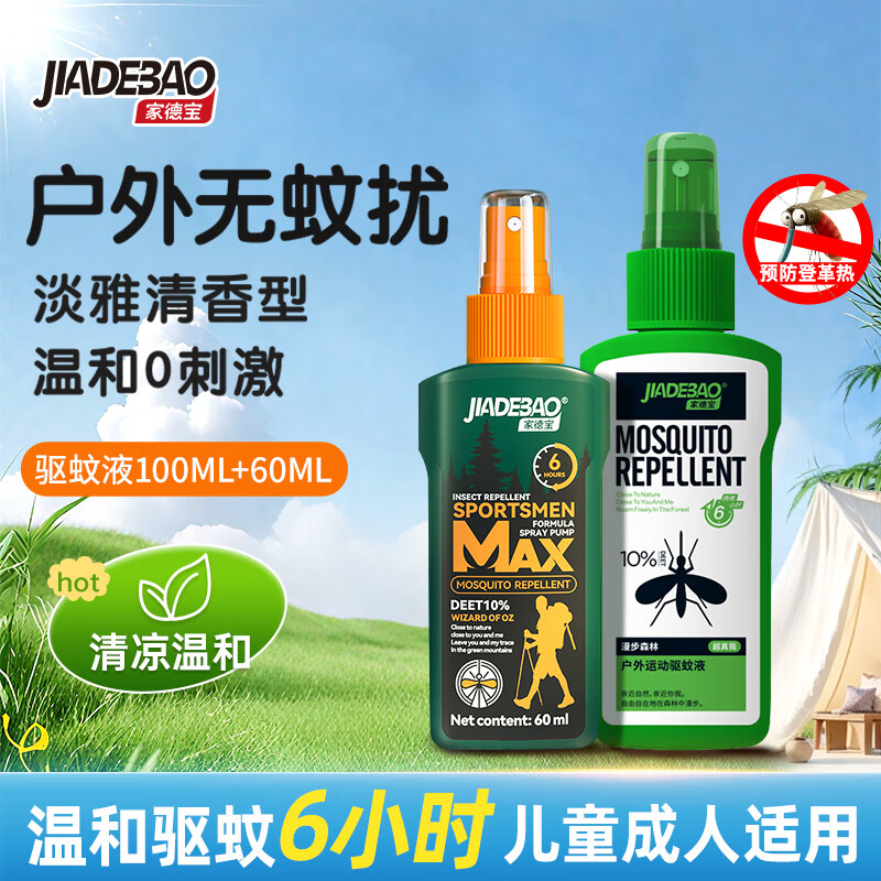¥23.8 家德宝(JIADEBAO)驱蚊喷雾 防蚊虫叮咬花露水 户外驱蚊液不叮10%避蚊胺15%驱蚊神器 [10%避蚊胺-驱蚊6h]100+60ml经典 驱蚊液 43.8