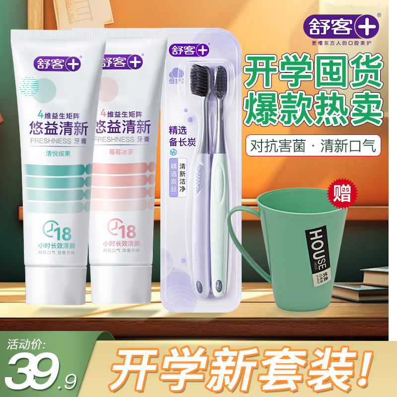 ¥29.9 舒客益生菌牙膏亮白牙齿减少牙渍牙菌斑清新口气学生开学好物学生实惠 (莓莓+鲜果)*2+炭丝*2 39.9
