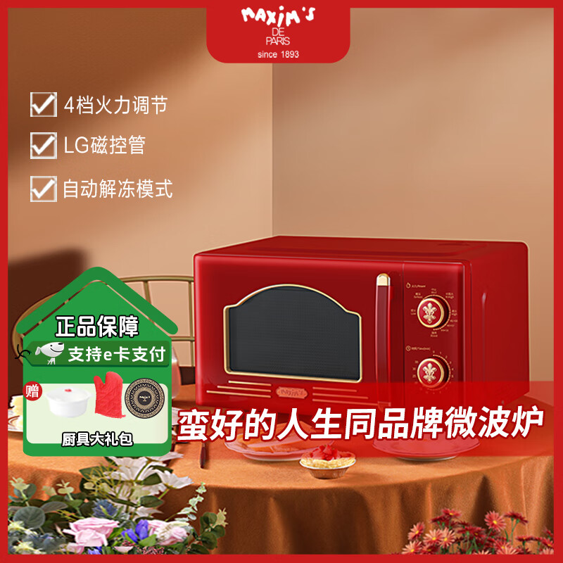¥399 MAXIM'S马克西姆复古微波炉 简单旋钮操控20L小型家用微波炉转盘式 枫叶红 600