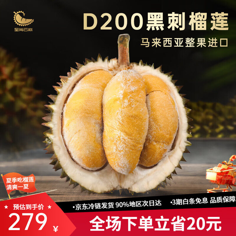 ¥279 至尚云巅黑刺榴莲冷冻生鲜水果D200 2.5-3.0斤【尝鲜热销中 保4房】 289