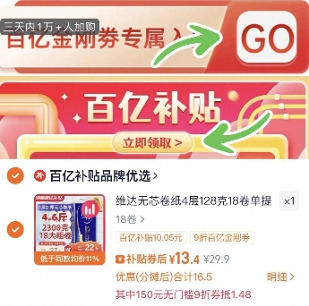 百亿补贴29.9元,价格下拉详情领百亿补贴金刚券-再返回详情页-百亿补贴点进去拍,实付13.4元包邮,维达超韧无芯卫卷128克18卷
