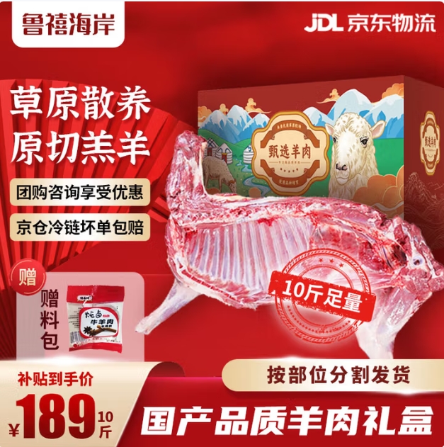 189元包邮!鲁禧海岸 内蒙新鲜羊肉 分割半只羊10斤礼盒