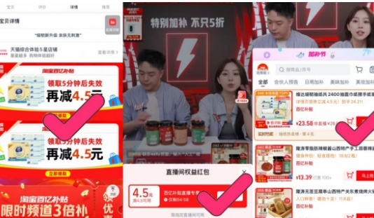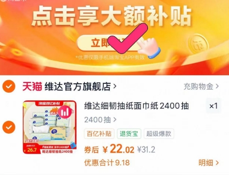 百亿补贴31.2元,商品页面价格下拉详情领4.5元红包-跳转直播间加购1件,然后商品页价格下拉详情页 淘金币点进去加购1件,最后购物车修改数量1件,实付22元包邮,好价抽纸‼