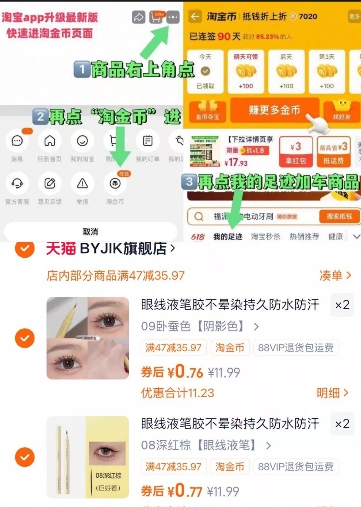 在售价11.99元,领8元券,商品右上角3个点,选淘金币-再选 我的足迹-找到商品拍4件,防水眼线笔,付3元包邮;